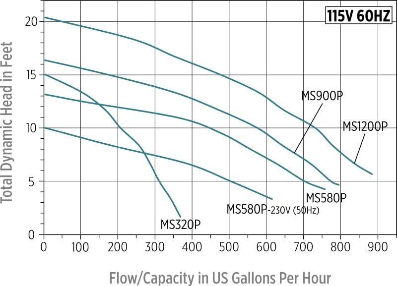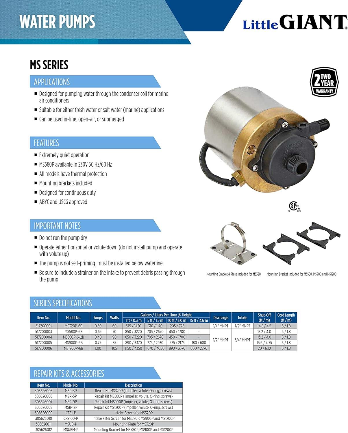 The Little Giant MS900P-6B 115 Volt, 890 GPH pump is designed for pumping water through the condenser coil for marine air conditioners. This pump is extremely quiet operation and is suitable for either fresh water or salt water (marine) applications. This pump is ABYC, USCG and CSA certified. This oil-less, continuous duty, thermally protected pump can be used submersed or in-line. This is not a self-priming pump so if it is used in-line the pump must be placed at a lower level than the water level. The MS900P-6B comes with a 6-ft. plug-less cord and mounting brackets.
