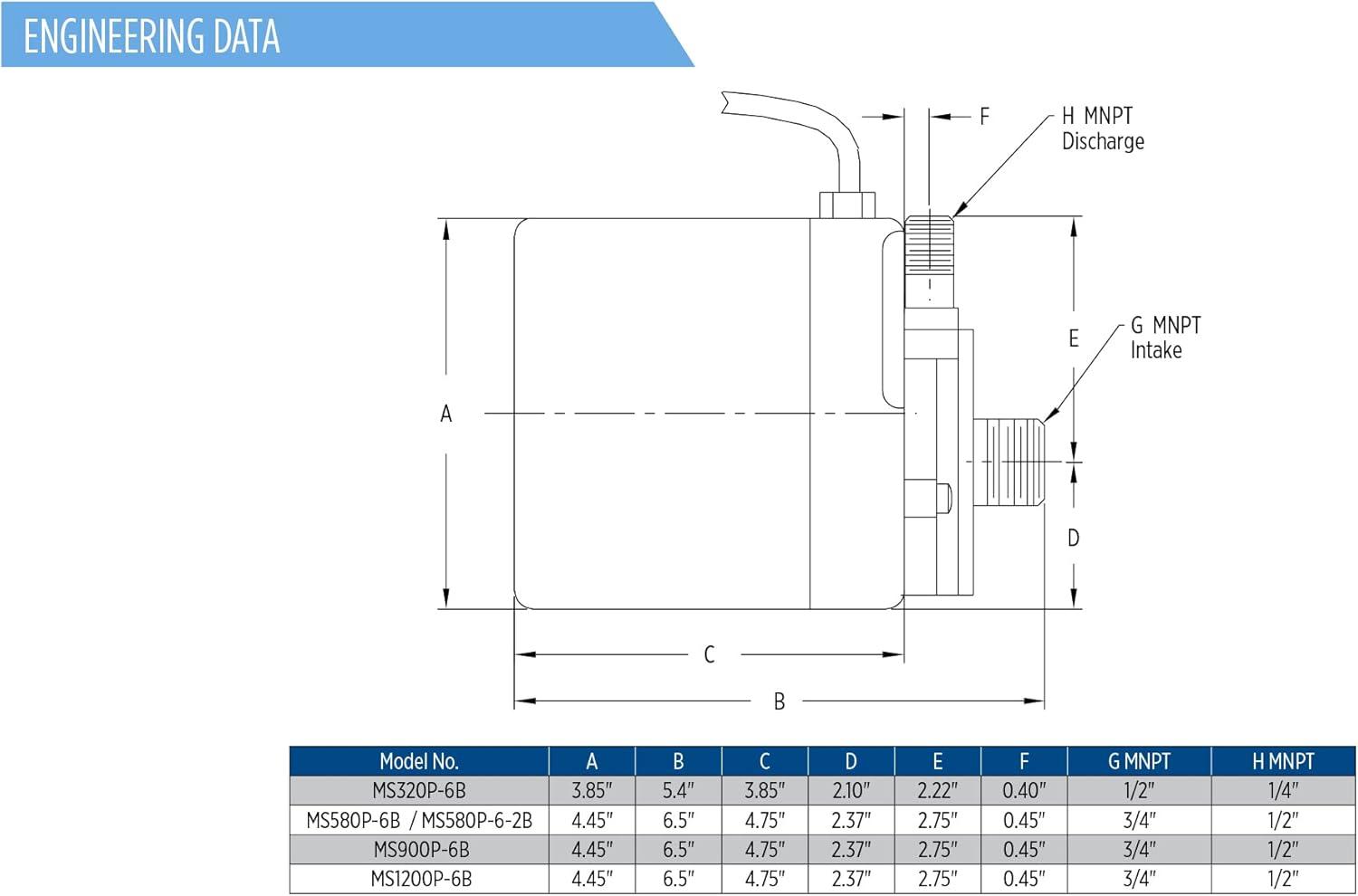 SPECIFICATIONS: 115 Volt; 0.75 running Amps; 85 Watts; 890 GPH at 1-ft. lift; 1/2-inch MNPT discharge; 3/4-inch MNPT intake; 15.6-ft. shut-off; 6-ft. cord (plug-less)