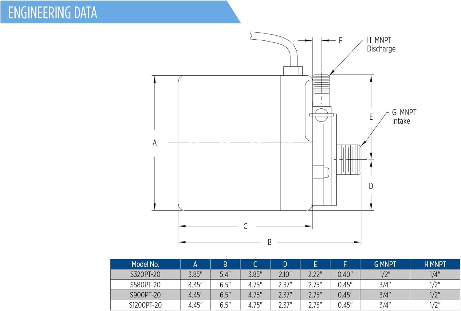 SPECIFICATIONS: 115 Volt; 0.75 running Amps; 85 Watts; 795 GPH at 1-ft. lift; 1/2-inch MNPT discharge; 3/4-inch MNPT intake; 15.6-ft. shut-off; 20-ft. cord